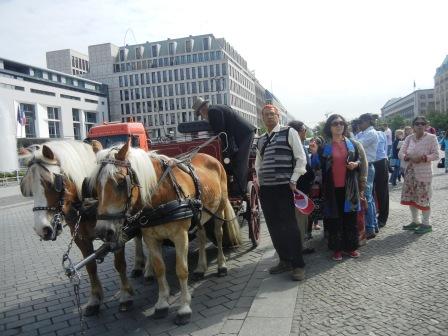 বাস ছাড়লো সকাল ৯টায়। আমাদের প্রথম গন্তব্য ব্রান্ডেনবার্গ গেট। সেটি ঐতিহাসিক পটভূমিকার বিচারে অত্যন্ত গুরুত্বপূর্ণ। বহু রাজনৈতিক মিটিং মিছিলের সাক্ষ্য বহন করছে ঐ গেট। সেটি প্রকৃত অর্থেই বার্লিন তথা জার্মানির স্মারক। দ্বিতীয় বিশ্বযুদ্ধে মিত্র শক্তির কাছে পরাজিত জার্মানির বহু সম্পত্তি, ঐতিহাসিক নিদর্শন ক্ষতিগ্রস্ত হলেও আশ্চর্যজনকভাবে গেটটি বেঁচে যায়। গেটের দু’ধার লিন্ডন গাছ দিয়ে চমৎকার ভাবে সাজানো। দেখে আমাদের শহরের চৌরঙ্গী স্কোয়্যারের কথা মনে পড়ে যায়। সবাই মিলে একাধিক ছবি তোলা, নিকটবর্তী দোকান থেকে ব্রান্ডেনবার্গ স্মারক সংগ্রহ সব কিছুই হলো অত্যন্ত দ্রুততার সঙ্গে কারণ সময় কম। এখানে সব সময়েই উৎসবের মেজাজ বজায় থাকে। অন্যভাবে বললে এই অঞ্চলকে বিদেশীদের মিলনক্ষেত্রও বলা চলে। দেখতে পেলাম সুসজ্জিত ঘোড়ার গাড়ি। ঘোড়াদের চেহারাও পুরো জার্মানদের মতন। আর কোচোয়ান নিয়ে তো কথাই হবেনা, যেমন বিশাল চেহারা তেমনই ভারী গলা, সঙ্গে তার ছায়াসঙ্গী পোষ্য কুকুর ও বাঁদর।