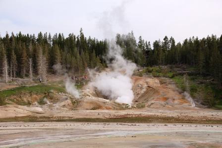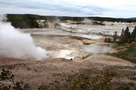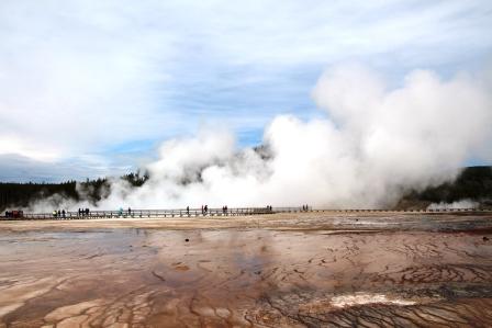 লাঞ্চ সেরে চললাম মিডওয়ে গিজার বেসিনের দিকে। এখানে আছে বিভিন্ন রঙে ভরা গ্র্যান্ড প্রিজমেটিক স্প্রিং (Prismatic spring), এখানকার মধ্যে সর্ববৃহৎ প্রায় ৩৭০ ফুট ব্যাস বিশিষ্ট বৃত্তের ন্যায়। গাঢ় নীল বর্ণের এই জলাধারের চতুর্দিকে হলুদ ও কমলা বর্ণের থারমোফাইলগুলি এক অনবদ্য দৃশ্যের (Prismatic effect) অবতারণা করেছে। হাইকিং ট্রেনে উঠলাম রেইন কোট পরে কারণ বৃষ্টি তখনও থামেনি। তবে প্রায় বৃত্তের আকার আমাদের ক্যামেরায় ধরা দিল না। নিকটবর্তী পাহাড়ে উঠে এর আসল চিত্র পাওয়া যায়। বৃষ্টি থামল এবারের গন্তব্য স্থল নরিস গিজার বেসিন (Norris geyser basin)।