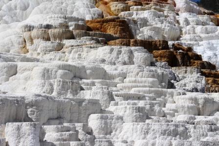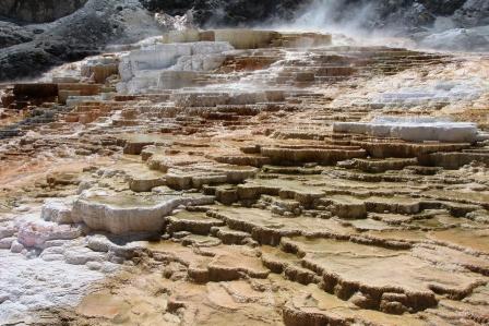 পরের দিন সকালে আরও একটি দর্শনীয় স্থান ম্যামোথ হট স্প্রিং (Mamoth hot spring)। এটা লাইমস্টোন ও অন্যান্য সেডিমেন্টারী রক সমৃদ্ধ, যা টেরাসের মতো দেখায়। টেরাস গুলো যেন জীবন্ত স্কাল্পচার। মিনার্ভা টেরাস (রোমান দেবী স্মরণে), জুপিটার ও মাউন্ট টেরাস যেন দারুন সুন্দর ভাবে রং করা, লিবার্টি ক্যাপ ওপাল টেরাস ৩৭ ফুট উঁচু, ফরাসী বিপ্লবের স্বাধীনতা ও মুক্তির প্রতীক। খুব গরম জলে থাকে সাদা আর হলুদ বর্ণের থার্মফাইল আর ঠান্ডা জলে থাকে কমলা, সবুজ ও গাঢ় বাদামী রঙের বর্ণের থারমো ফাইল, যারা টেরাসকে নানা রঙে রাঙিয়ে তুলেছে। কিছু হট স্প্রিং অনবরত বন্ধ হচ্ছে, আবার নতুন নতুন সৃষ্টি হচ্ছে, তাই ম্যামোথ হট স্প্রিং কোন দিন শুকিয়ে যাবে না ধরে নেওয়া যায়।